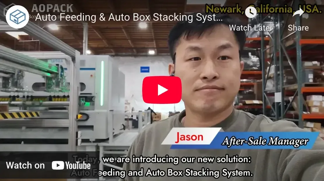 In this video and project showcase, Aopack presents its Auto Feeding and Auto Box Stacking System, successfully installed at a customer site in the United States, demonstrating a higher level of automation for heavy duty box making machines.