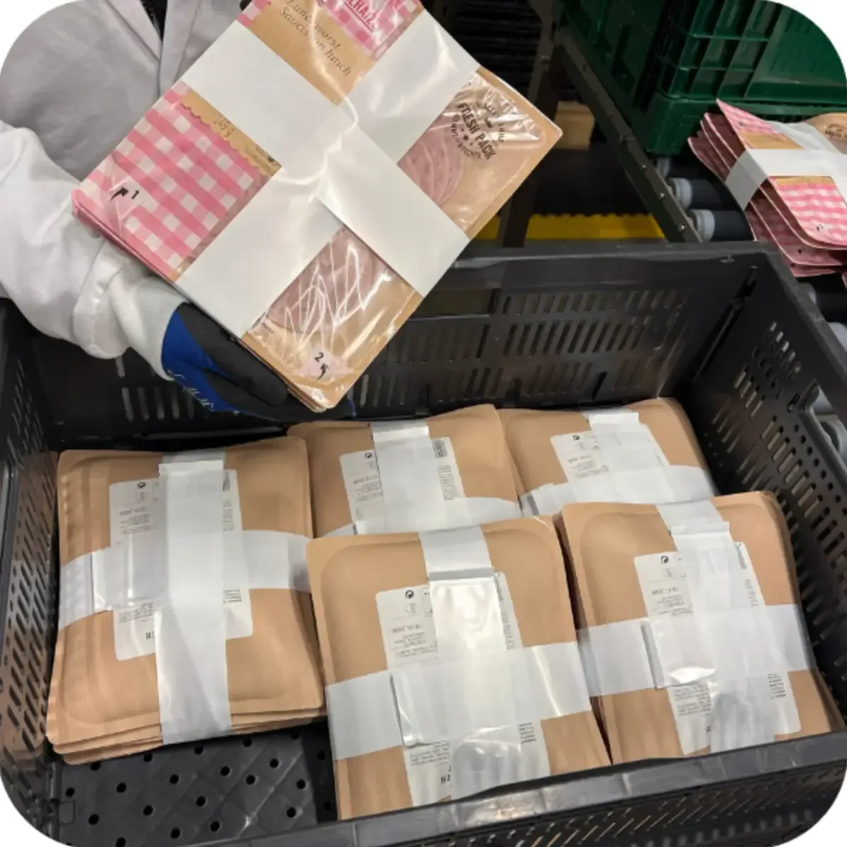 As a packaging partner to major retailers, Delibarn is responsible for receiving pre-supplied meats, slicing and packaging them, complete with the retailer’s branding and labeling requirements. But their job doesn’t stop at presentation. Delibarn must also ensure that every packaged product is prepared for efficient handling, stacking, and delivery. The sliced meats are placed on flexible plastic trays, sealed with film, and labeled with all necessary product and brand details. Before shipping, these packages need to be neatly bundled and stacked into reusable plastic crates, often in custom batch sizes tailored to each retailer’s specific order.