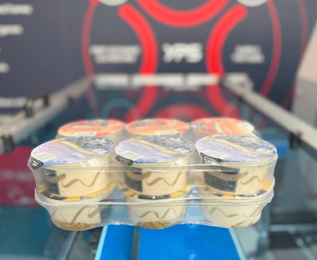- A side feed shrink wrapper allows for a controlled positive motion at the infeed, pushing the products into the wrapper and keeping the yoghurt pots stable while they are moving.