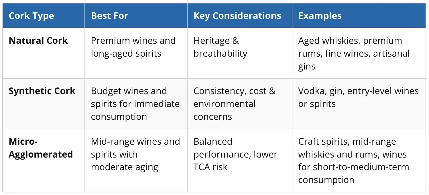 - Synthetic corks are good for spirits and wines intended for quick consumption or cost-sensitive products.