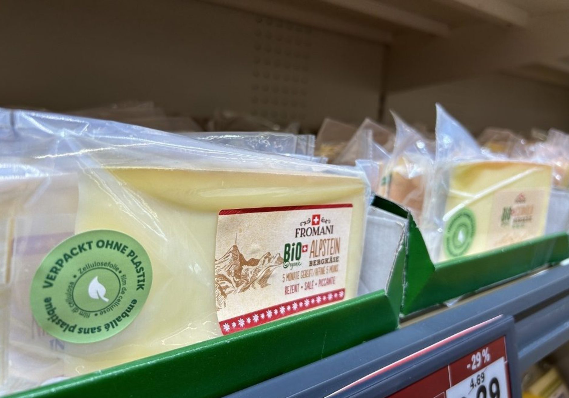 The new cellulose-based packaging is being used for Bio-Alpstein Mountain Cheese and Bio Usserrhödler Mountain Cheese. Unlike the previous plastic packaging, the cellulose film is free from fossil fuel-based raw materials and is made from wood residues sourced from FSC-certified forestry.