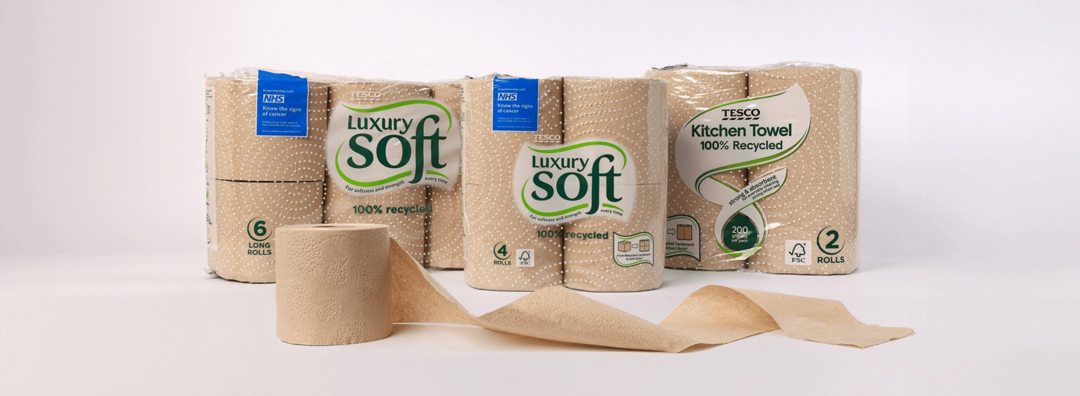 The new range includes 100% Recycled Brown Kitchen Towel and Luxury Soft 100% Recycled Brown Toilet Tissue in 4 and 6 Long Roll packs, available in 100 Tesco Extra stores initially.